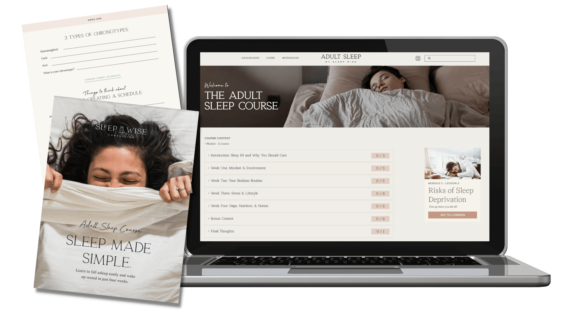 The Sleep Wise Adult Sleep Course is a self-paced course that walks you through making simple changes, week by week, for a total of 4 weeks. These small, sustainable changes will help you fall asleep faster, shorten any nighttime wakeups, and improve the quality of your zzzz's, so that you can feel more rested throughout your day.